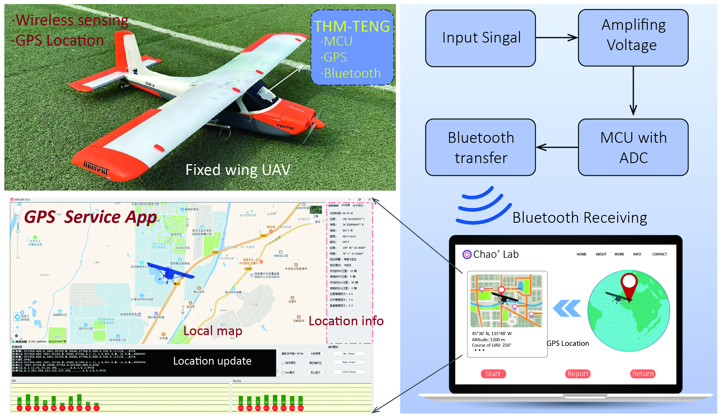 湍流引起的机翼结构振动和气流冲击已成为影响中小型固定翼无人机(UAV)适航安全的主要因素之一。高可恢复弹性密度的力学超结构可赋予材料和结构诸多增强性能,如高效机械能存储、强负载、高抗冲击性和优异运动敏捷性。然而,高刚度、高强度与可恢复大应变之间彼此矛盾,同时实现以上性能是现有材料/结构面临的世界性难题;此外,低延迟感知、分析实时振动/冲击载荷信息也是UAV适航预警的关键需求,受限于电阻式、压阻式、电容式等传感器依赖额外电源供给与结构轻量化约束的矛盾。团队通过手性双曲超结构(THM)和自供能感知单元(TENG)协同设计,所研发的THM-TENG防护结构高效的实现了冲击载荷的弹性可恢复吸收;在此过程中,THM-TENG将冲击能转化为电能,同时实现外部载荷的自供能传感。该防护结构集成了微控制单元MCU、无线传输系统、警报系统以及GPS定位系统,在UAV中展示了优异的防护-感知效果。该研究有望为新一代航空航天、机器人和智能无人系统设备的关键防护结构设计提供新思路。
