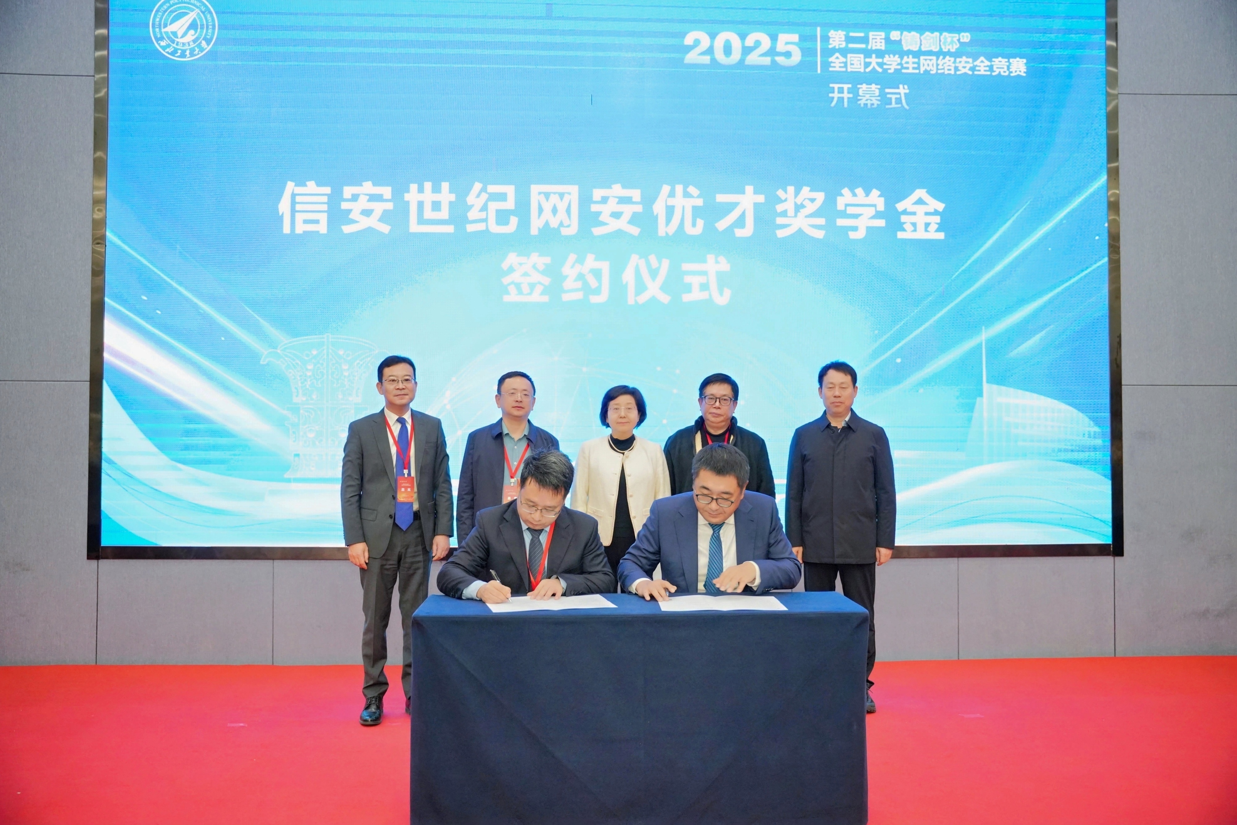 西工大对外联络办公室主任杨铭与北京信安世纪副总裁刘峥签署协议,在我校设立信安世纪网安优才奖学金,用以支持网安领域人才培养与学科建设。张艳宁、李建华、邓攀、关海鹏、李伟共同见证。