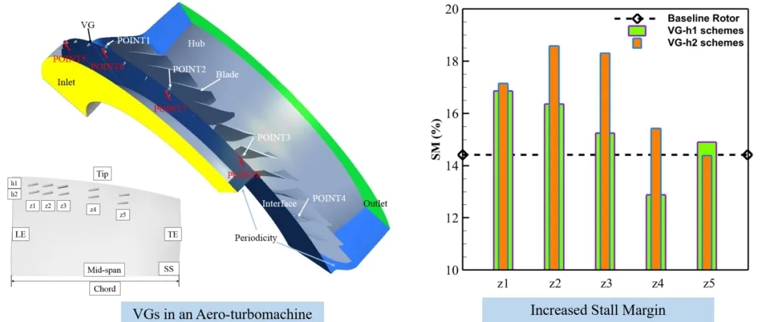 叶轮机械是民用航空发动机的关键部件,其技术水平是决定航空发动机耗油率等整体性能的重要因素之一。该项目首次将旋涡发生器直接应用于航空叶轮机械叶尖区域。气流经过叶尖旋涡发生器后会产生高能涡结构,可有效抑制叶尖泄漏涡破碎现象;同时,借助引入涡与端区流场的干涉作用,可高效地控制流动堵塞与分离现象。